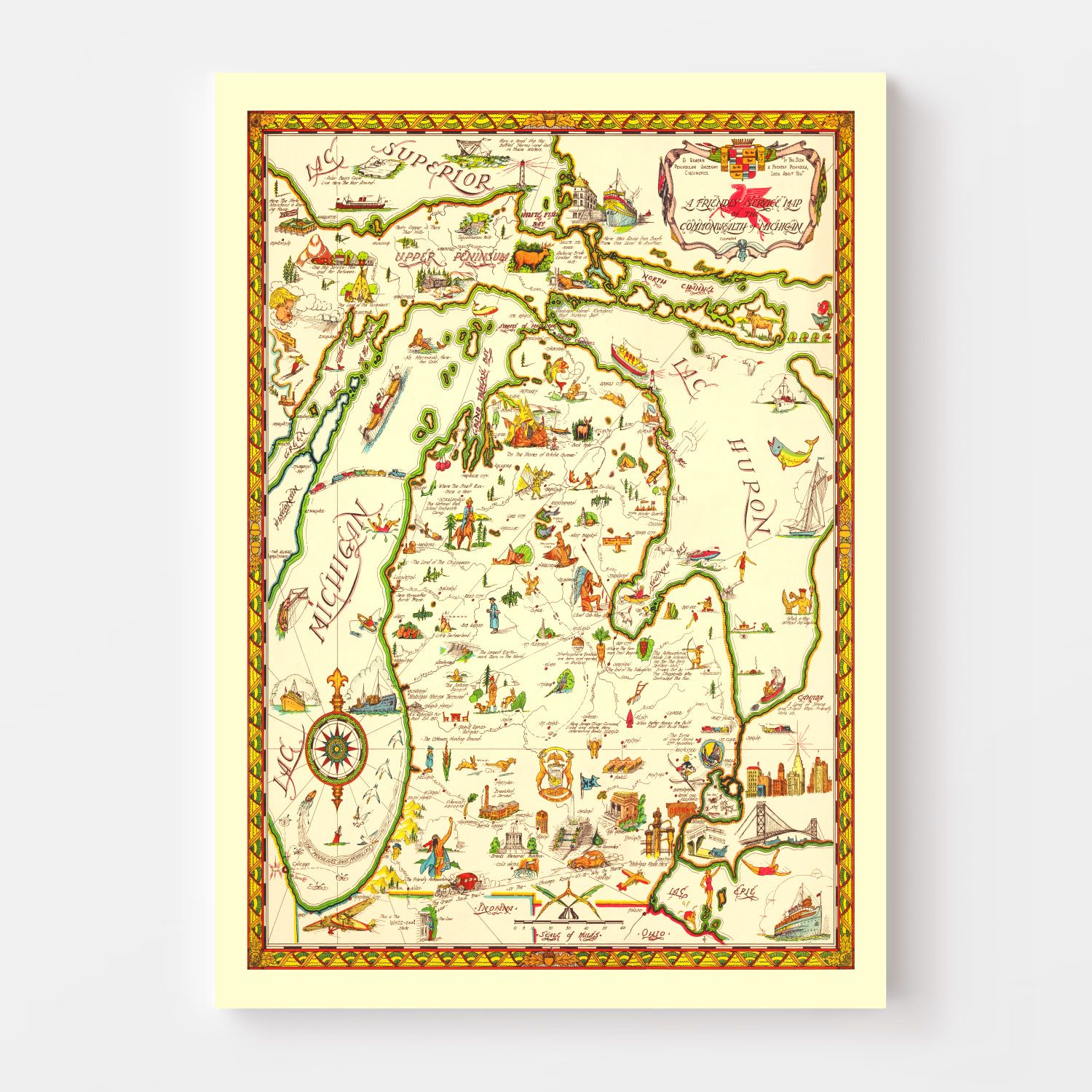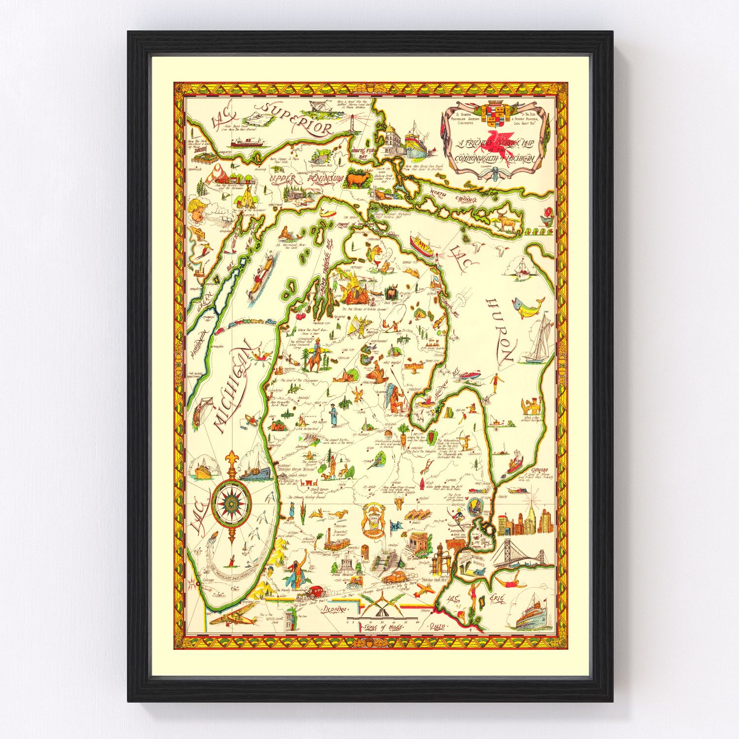 What sets this piece apart is its readiness to adorn your walls straight out of the box—no additional prep work required! Whether you're reminiscing about family roots or simply looking for a captivating addition to your space, this reimagined map serves as a timeless tribute to Michigan's rich past.