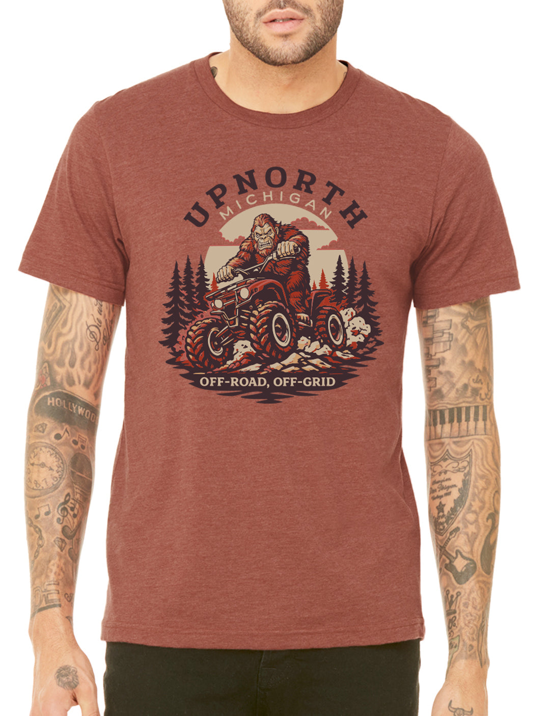 This Up North Michigan tee features Bigfoot himself ripping a 4-wheeler like he’s late for deer camp. Perfect for off-roaders, cabin dwellers, and anyone who considers “getting lost” a weekend plan. Soft, rugged, and Sasquatch-certified for comfort.