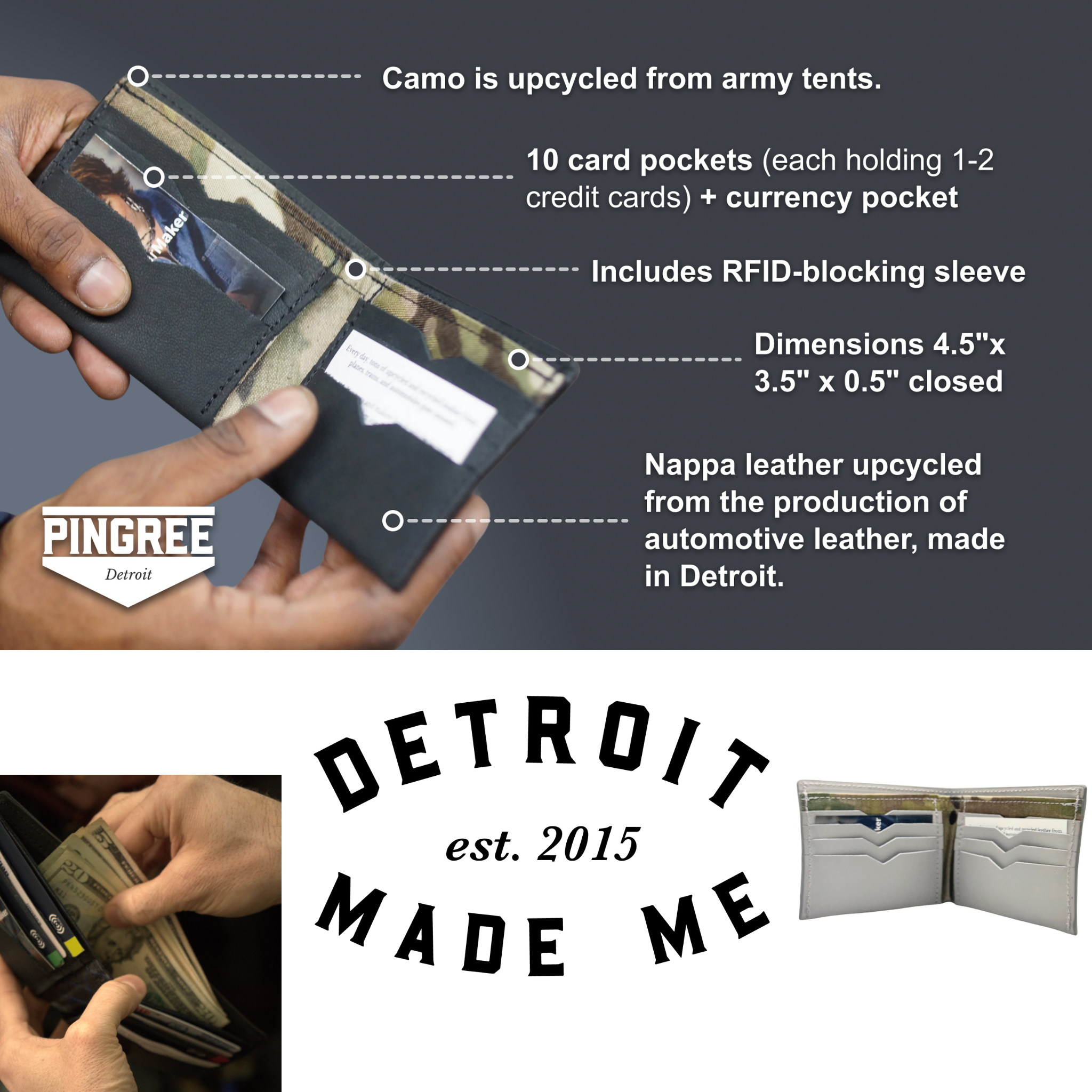 Our take on a classic style bifold wallet includes 10 card slots that each hold 1-2 cards. Upcycled army tent fabric lining or recycled ECOPAK fabric. Hand edge painted and embossed with the Pingree Detroit logo for a wallet as dynamic as the place it was named after.